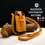 This is the Madison Crossbody Phone Bag featuring an adjustable front pocket for the phone and a back pocket for cards or other valuable. It has a generous inside compartment that can contain a long wallet and is cleverly closed with a magnet clasp. It is an easy project made out from small pieces of leather.