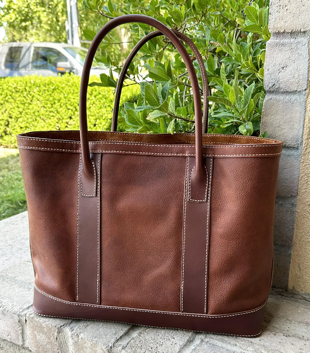 A cutter, round hole punch, hand stitching needles, rubber mallet and cutting pad. No sewing machine required — all our bags are hand stitched.